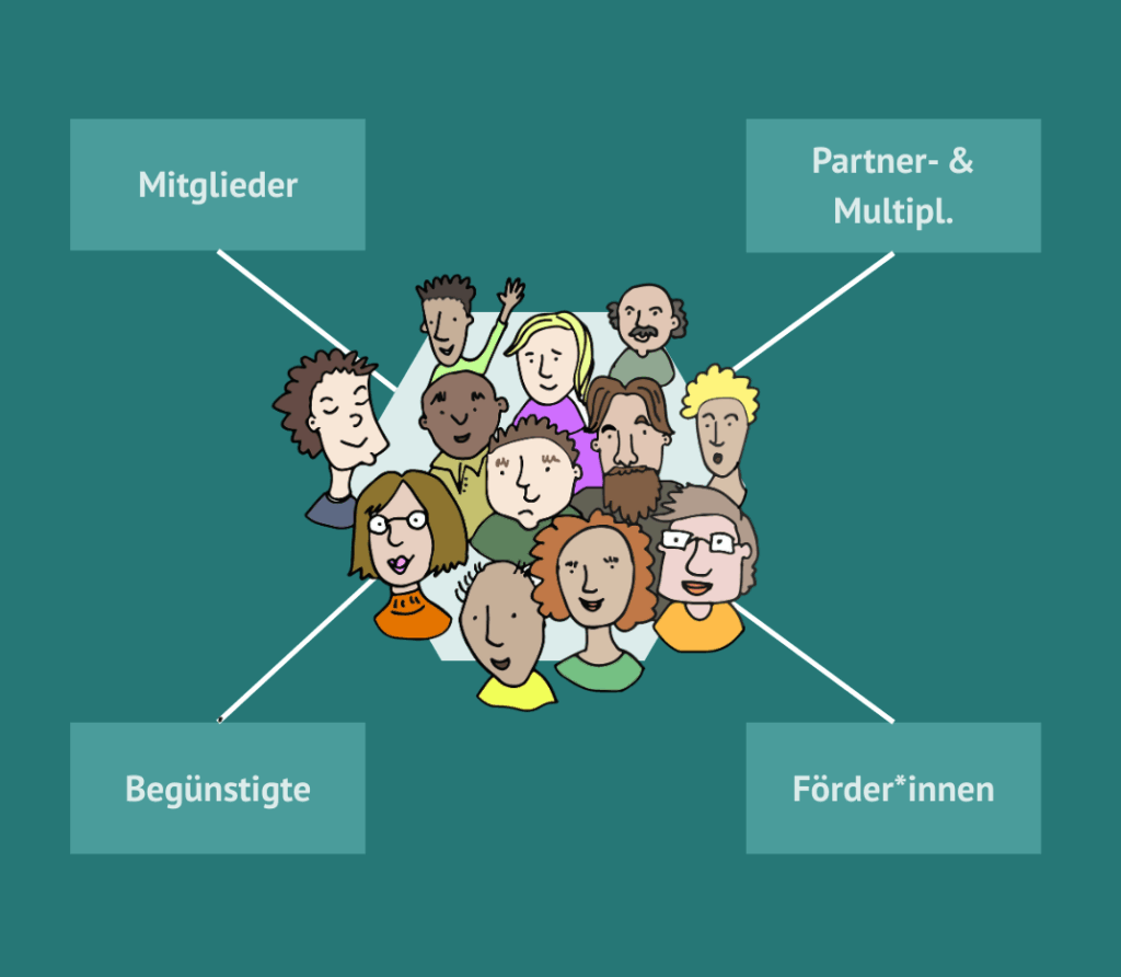 • oben rechts: Partner*innen & Multiplikator*innen – Organisationen oder Personen, die mit euch kooperieren oder euch weiterempfehlen können (befreundete Vereine, Verbände, Schulen, Engagementbeauftragte).